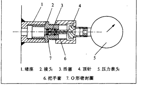如圖所示,堵座直接焊接在所要測定壓力的輸 油(水)管線上。首先把活塞和接頭裝配好,把接頭裝 在堵座上,這樣在管道壓力(一般在10MPa左右)作 用下,活塞向上移動,形成密封,這些部件裝好后直 接放在井上。另外一些部件按圖示,把頂針塞人把手 套,裝上壓力表,要測壓力時隨身攜帶。使用時將把 手套慢慢旋上接頭,由于管內(nèi)壓力,在旋入的過程當 中,頂針接觸活塞,此時頂針與活塞形成第一道硬密 封,在進一步的旋入過程中,活塞繼續(xù)向前推移,管 線內(nèi)液體從活塞側(cè)面孔進入頂針孔,即可測得壓 力。設(shè)計時考慮到第一道硬密封接觸面積小,有時密 封性能不佳,在結(jié)構(gòu)上可以設(shè)計第二道硬密封,即可 實現(xiàn)在測壓力時滴水不漏。