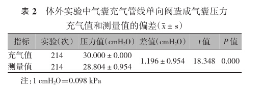 2.1.2充氣管線單向閥造成氣囊壓力充氣值和測量 值的偏差(表2):經(jīng)過214次的反復(fù)實(shí)驗(yàn),得到氣囊 接口單向閥斷開和連接造成氣囊壓力充氣值和測量 值之間的偏差,差異有統(tǒng)計學(xué)意義(t=18.348,P= 0.000)。
