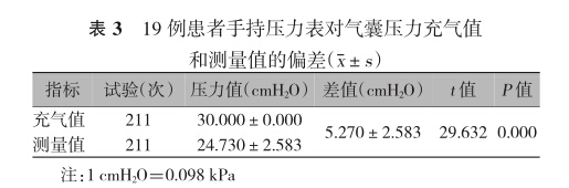 3.2充氣管線單向閥在間斷測量中造成測量值與 氣囊實(shí)際壓力值存在明顯偏差:除手持壓力表本身 的因素外,采用充氣后斷開、測量時再連接的方法進(jìn) 行氣囊壓力檢測時,氣囊充氣管線單向閥在與壓力 表斷開和連接過程中的漏氣也是造成測量值與氣囊 實(shí)際壓力值存在偏差的原因之一。由于充氣管線單 向閥的設(shè)計特點(diǎn),不同操作者在進(jìn)行氣囊壓力測量 時手部操作存在差異,導(dǎo)致漏氣,這個損失值平均為 (1.196±0.954) cmH2O,本研究稱之為“誤差損失 值”?!罢`差損失值”難以避免,只能盡量減小。