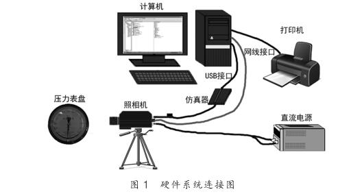 本系統(tǒng)的硬件連線圖如圖1所示。照相機(jī)由12 V直流電 源供電,拍照獲得壓力表盤圖像后,采用以太網(wǎng)接口通過網(wǎng)線與 計(jì)算機(jī)連接傳輸圖像, 計(jì)算機(jī)將采集圖像進(jìn)行預(yù)處理后識別表 盤讀數(shù),完成表盤重繪后再送給打印機(jī)打印輸出表盤。