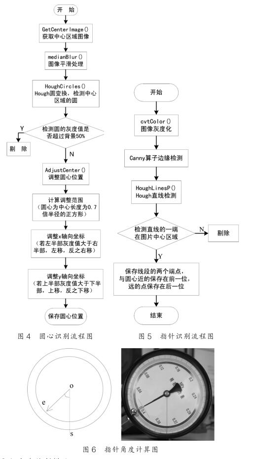 模式識別是本軟件最核心的模塊,主要包括了圓心識別、指 針識別以及指針角度計(jì)算三個(gè)部分,圓心識別主要利用Hough 圓變換,指針識別則首先利用Canny邊緣檢測算子檢測出圖像 的邊緣信息[2],然后用Hough直線檢測來提取識別指針直線。