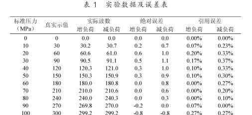 本實(shí)驗(yàn)首先選用了某儀表廠生產(chǎn)的壓力表進(jìn)行驗(yàn)證,實(shí)驗(yàn) 數(shù)據(jù)及誤差如表1所示。