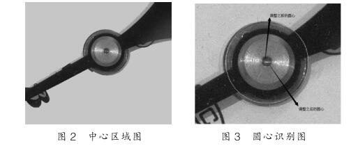 其中Hough圓變換首先獲取的中心區(qū)域如圖2所示,經(jīng)過 Hough圓變換后得到圓心并進(jìn)行調(diào)整后的圓心位置對比效果 如圖3所示。