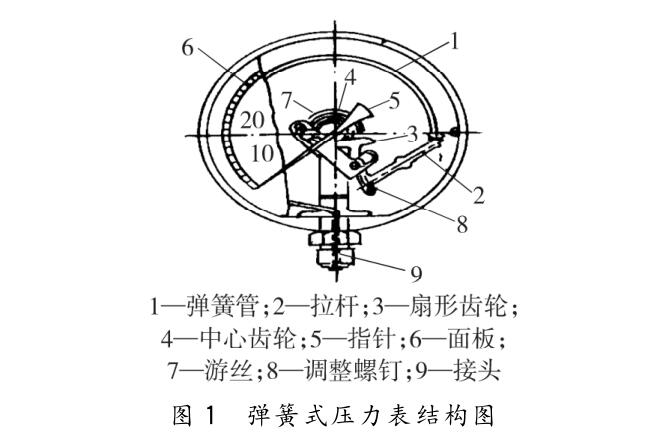 在化工企業(yè)中,最常使用的則是彈簧式壓力表, 且主要由接頭、度盤、指針、稱圈、傳動機構(gòu)等組成, 具體如圖1所示。