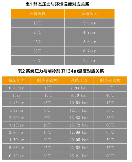 高壓側(cè)壓力與冷凝器的冷凝能力及冷凝器中的制冷劑存儲量 密切相關(guān)。如冷凝能力提高,制冷劑迅速從氣態(tài)冷凝成液態(tài),相 應(yīng)的高壓側(cè)壓力就會降低。如果冷凝器內(nèi)制冷劑存量增加,將會 導(dǎo)致壓力升高。另外,我們還要了解系統(tǒng)靜態(tài)壓力與環(huán)境溫度的 對應(yīng)關(guān)系(表1),以及系統(tǒng)在不同壓力狀態(tài)下,所對應(yīng)的制冷劑溫 度(表2)。系統(tǒng)靜態(tài)壓力是未開空調(diào)時所測得的壓力,制冷劑溫度 與壓力對比可通過壓力表間接判斷(見表1、2)。壓縮機工作溫度 在65C至80C之間,冷凝器溫度在55C至70C之間,蒸發(fā)箱由 約55C將至-7C。