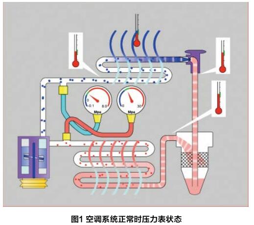 當然,所有這些的前提是,我們必須深刻了解管路壓力所代 表的深刻真正含義,只有這樣,才能通過檢測得到的管路壓力來進行精準判斷,否則管路壓力檢測工作就毫無意義。為此,筆者 借助工作實踐,對空調(diào)管路壓力檢測的幾種情形及對應(yīng)的故障, 進行了系統(tǒng)梳理和總結(jié),供汽修同仁們在維修空調(diào)時參考。