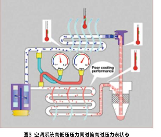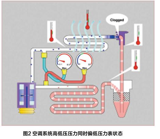 在檢測汽車空調(diào)的過程中,如果檢測到高壓側(cè)和低壓側(cè)的壓 力同時低于正常值(圖2),則可能的故障原因有:系統(tǒng)制冷劑加注 量不足、壓縮機與干燥罐之間有堵塞。