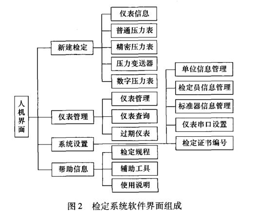 系統(tǒng)軟件以Visual C + + 6. 0為開發(fā)平臺,采用基 于ODBC的數(shù)據(jù)庫管理系統(tǒng),數(shù)據(jù)庫系統(tǒng)采用Mi-crosoft Accesso系統(tǒng)軟件可實現(xiàn)壓力數(shù)據(jù)的自動米集 和自動保存,并根據(jù)檢定儀表信息智能判斷被檢儀表 是否合格,能自動生成并打印檢定原始記錄和檢定證 書,能建立被檢壓力表信息,可查詢歷史檢定記錄,便 于壓力表檢定信息管理,原始記錄模板以及檢定證書 模板可在Word中自由編輯,靈活方便。圖2所示為 本文所述檢定系統(tǒng)軟件界面組成框圖,采用多級菜單 模式實現(xiàn)儀表的新建檢定、儀表管理、系統(tǒng)設置、幫助 信息等功能。