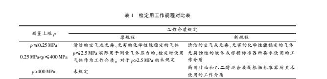 新規(guī)程中規(guī)定了按精密壓力表不同測(cè)量上限 規(guī)定用工作介質(zhì)不同,比原規(guī)程進(jìn)行了細(xì)化,對(duì)比如 表 1 所示。