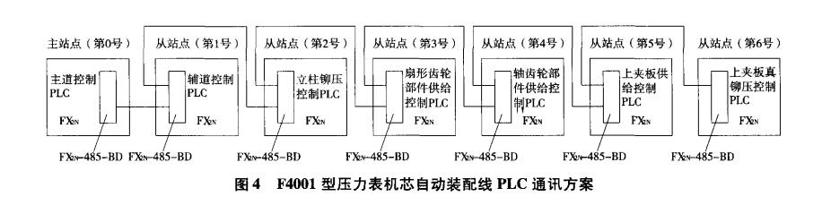 整個裝配設(shè)備的機(jī)構(gòu)系統(tǒng)設(shè)計(jì)完成后,需要考慮 采用何種控制系統(tǒng)來實(shí)現(xiàn)整機(jī)的自動化控制。由于 PLC具有設(shè)計(jì)、安裝、接線、調(diào)試工作量小,研制周期 短,可靠性高,抗干擾能力強(qiáng),故障率低,維護(hù)方便等 域得到廣泛的應(yīng)用。所以采用PLC作為裝配線的 主控制系統(tǒng),能滿足生產(chǎn)的需要。F4001型壓力表機(jī) 芯自動裝配線的5個裝配工作單元、2條傳動鏈分別 由7臺三菱FX2N系列PLC控制,其中上夾板預(yù)鉚 壓、上夾板預(yù)鉚壓檢測單元動作較簡單,且固定在主 道傳動鏈機(jī)架上,因此與主道傳動鏈共用1臺PLC 控制。整個裝配線長度在9m左右,各裝配單元之間 相互獨(dú)立,只與主道傳動鏈間有任務(wù)請求和協(xié)同關(guān) 系,因此各裝配單元控制PLC與主道控制PLC之間 需要建立通訊。三菱PLC常用的通訊模式有CC- LINK模式和485模式,考慮到485通訊模式成本較 低,且當(dāng)前的單元間的通訊距離在50m范圍內(nèi),485 通訊模式的可靠性能滿足系統(tǒng)運(yùn)行需要。因此, 壓力表機(jī)芯自動組裝線各單元間采用了 485通訊模 式,如圖4所示。上述內(nèi)容提到裝配線的任何工位耗 時都不得超過3S,因此各裝配單元采用并行工作的方 式可提高效率,如圖5所示。在系統(tǒng)復(fù)位結(jié)束后,各裝 配單元并行工作,在主道運(yùn)行到位后,通過485通訊模 式向各裝配單元發(fā)送供料或裝配請求信號,3、4、5號 從站裝配單元根據(jù)前一裝配單元的供料狀況依次完成 供料動作,6號從站再根據(jù)預(yù)鉚壓檢測結(jié)果確定是否 執(zhí)行真鉚壓。