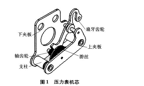 壓力表機(jī)芯(core of pressure gauge)是壓力表專用 的傳動放大機(jī)構(gòu),能將彈簧管自由端的直線位移變?yōu)?角位移,使彈簧管的微小位移量放大,從而使指針獲得 與所測壓力成比例的較大轉(zhuǎn)角,以保證壓力表有足夠 的讀數(shù)精度,達(dá)到容易觀察指示值的目的⑴。壓力表 機(jī)芯由軸齒輪、扇形齒輪、游絲以及包括上、下夾板和 支柱構(gòu)成的機(jī)架等組成⑴。壓力表機(jī)芯屬精密機(jī)械零 部件,其裝配工藝是壓力表制造過程中非常重要的環(huán) 節(jié),其裝配品質(zhì)的好壞直接影響壓力表示值的精度等 級。
