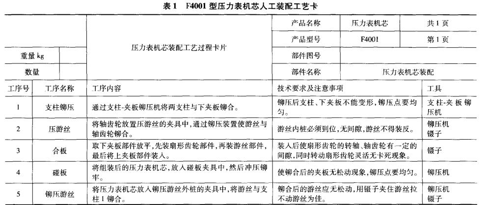 某公司生產(chǎn)的F4001型壓力表機(jī)芯如圖1所示, 其傳統(tǒng)的人工裝配工藝如表1所示。