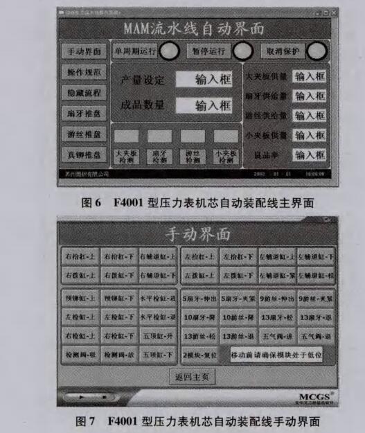 由于丨1LC本身不具備人機(jī)交互功能,控制系統(tǒng)工 藝參數(shù)較多,需要人機(jī)交互時,使用具有觸摸操作功能 的觸摸屏是一種很好的選擇Biu F4001型壓力表機(jī)芯 自動裝配線采用昆侖通態(tài)MCGS TPC1062KX彩色觸 摸屏,用于執(zhí)行指令輸人、手自動控制切換、參數(shù)設(shè)置、 裝配產(chǎn)量4質(zhì)M統(tǒng)計(jì)、監(jiān)控_面顯示以及故障原因顯 示等,如閣6、圖7所示。將觸摸屏畫面使用專用軟件 在計(jì)算機(jī)h設(shè)汁完成后,再通過計(jì)算機(jī)的RS232串行 通訊口下載到觸摸屏PLC對觸摸屏實(shí)時數(shù)據(jù)庫進(jìn) 行讀寫,達(dá)到兩者之間的信息交互。
