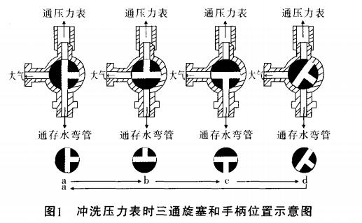 主要應(yīng)嚴(yán)格按沖洗壓力表的操作程序進(jìn)行操作,BP應(yīng)特別注意不讓高溫蒸汽進(jìn)人壓力表彈簧彎管內(nèi)。正確 的操作程序如圖1所示。