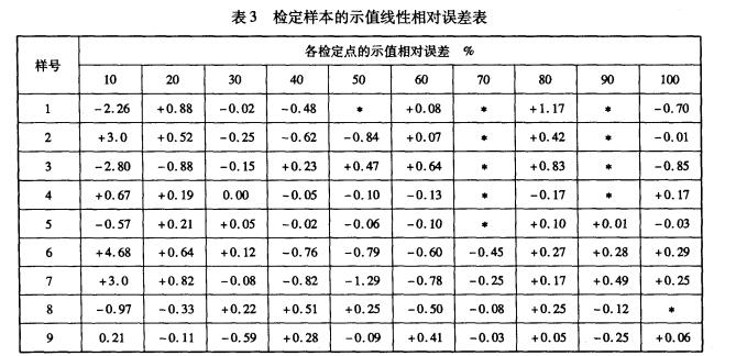 ui = ((Pi ~ P?/ P?) x 100 (式 1) 由式1得到的各樣本在相當(dāng)于裝置工作壓力 10%?100%范圍內(nèi)各檢定點(diǎn)的示值線性相對(duì)誤差如 表3所示。