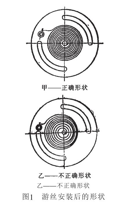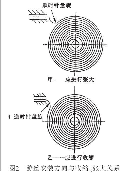 4.壓力表游絲的安裝與拆卸 其方向有兩種,按張大游絲的方 向安裝,其游絲的作用力大,指針緊靠 表盤(pán)限止釘。按收縮游絲的方向安裝, 其游絲的作用力平穩(wěn)(如圖2所示)。此 外,在安裝與拆卸時(shí)要注意以下幾點(diǎn):