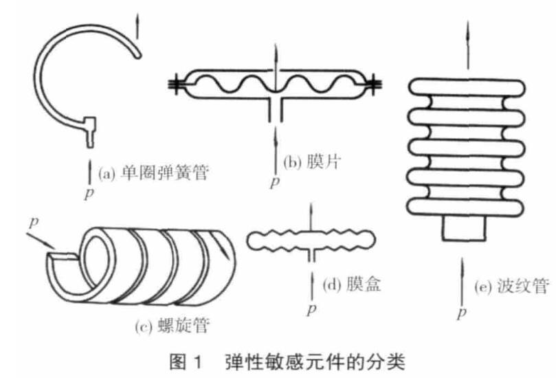 根據(jù)彈性敏感元件形狀的不同,可以將其分為 彈簧管式(單圈彈簧管和多圈彈簧管即螺旋管)、膜 片式、膜盒式和波紋管式,圖1為彈性敏感元件的 分類。