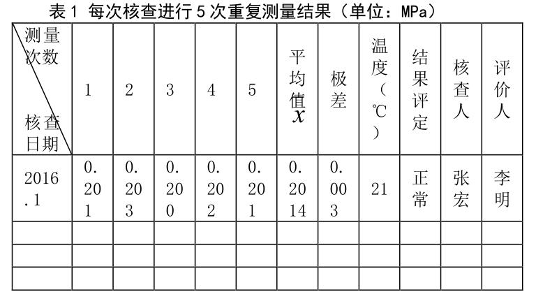 (3)核查測(cè)量過(guò)程:用精密壓力表對(duì)普通壓力表在2MPa 點(diǎn)上重復(fù)做4組、每組5次重復(fù)測(cè)量,測(cè)量時(shí)的環(huán)境溫度為 21C。依據(jù)所測(cè)數(shù)據(jù)求得平均值X為2.0028MPa、極差值7 為 0. 002MPa。
