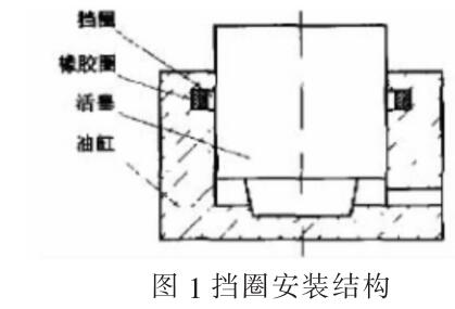 1)擋圈尺寸精度不足擋圈的內徑小、厚度薄,厚度控制在 0.8mm左右!但在測量內徑或人為操作時,擋圈受力不均勻會發(fā)生 形變!導致整體的平整度不足!受到損傷!造成厚度不均、安裝后 密封性差。2)擋圈材料強度不足如圖1所示!擋圈常用兩種材料 配合使用!內圈為塑料材質,外圈為橡膠材質!擋圈的強度會受到 高強壓力的破壞導致結構失穩(wěn)!發(fā)生泄漏情況。3)排除措施擋圈 的損壞主要集中在機械損傷方面!因此在更換擋圈時!其一是要 加強擋圈的材質!提高其強度!并要經過破壞性試驗驗證其實際 性能;其二是對擋圈的內徑和厚度尺寸進行優(yōu)化!適當調整其與 油缸之間的間隙,并加強結構間的精度和光整度,減少其對密封 性的破壞。