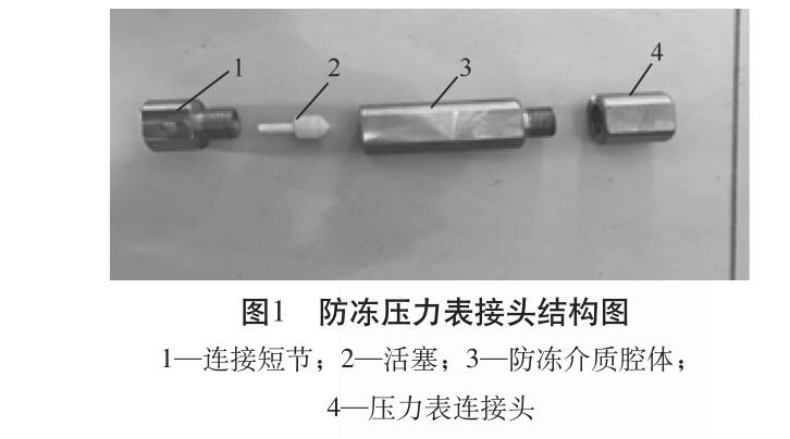 防凍壓力表接頭由連接短節(jié)、活塞、防凍介 質(zhì)腔體、壓力表連接頭4部分組成,如圖1所示。 依靠活塞將腔體內(nèi)的防凍介質(zhì)傳導(dǎo)至壓力表,可 以實(shí)現(xiàn)冬季正常顯示設(shè)備或管路壓力,可用于油 田的油水井和多數(shù)壓力設(shè)備。