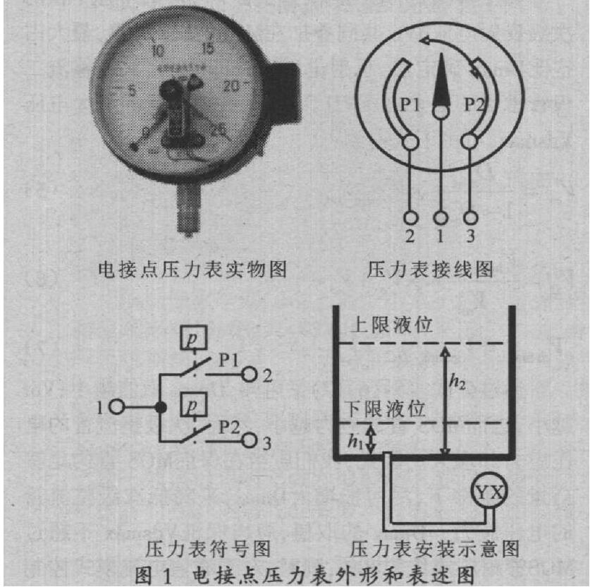 實(shí)際中,電接點(diǎn)壓力表通過管道安裝在水池的下方,以方便取得液體壓力信號。一般綠針P1為下限 (低液壓)觸點(diǎn),引出線標(biāo)號為2,紅針P2為上限(高液壓)觸點(diǎn),引出線標(biāo)號為3,兩者根據(jù)需要人為調(diào)節(jié)設(shè)定; 黑針指示液體壓力的實(shí)時(shí)值,引出線標(biāo)號為1。當(dāng)黑針轉(zhuǎn)動到與綠針重合時(shí),1、2導(dǎo)通,低位開關(guān)P1閉合; 當(dāng)黑針轉(zhuǎn)動到與紅針重合時(shí),1、3導(dǎo)通,高位開關(guān)P2閉合。